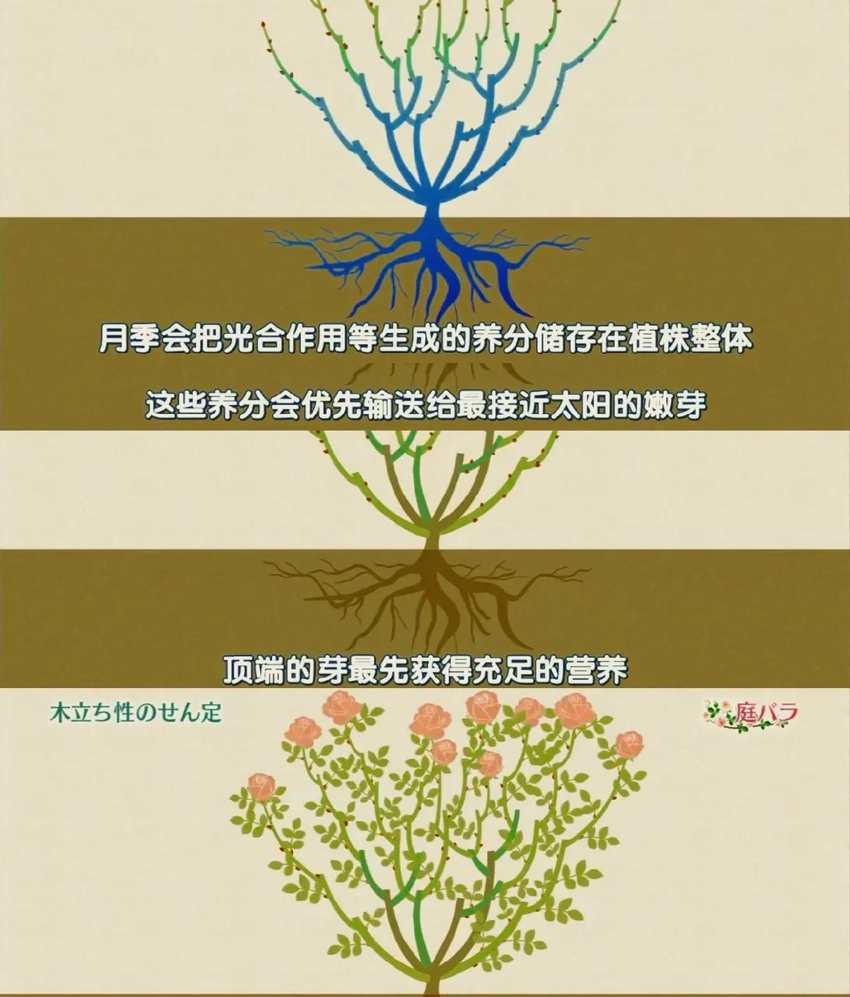 以伞房状花簇月季为代表“多分枝型”枝条数越到顶端越多,会优先从顶端生长出新枝条开花。顶端优势:月季会把光合作用等生成的养分储存在植株整体,这些养分会优先输送给最接近太阳的嫩芽,顶端的芽最先获得充足的营养。対多分枝型的灌木月季,修剪位置将改变植株的整体印象。将去年生长的枝条剪掉一半的结果:枝条剪的比较靠上,会开出很多小花。枝条修剪的深,花朵数量会减少,但是花朵大而豪华,或者花序丰满。