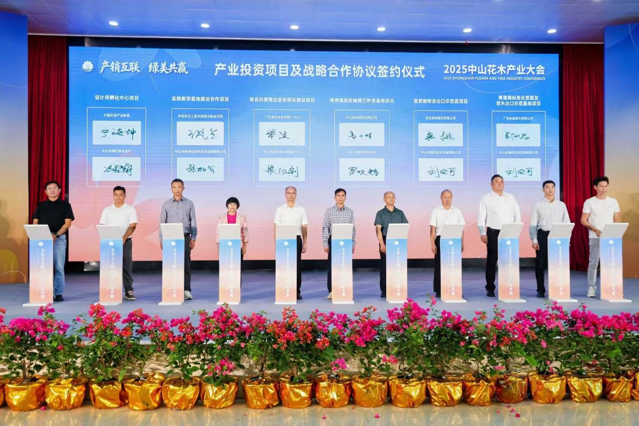 在招商合作集中签约环节,多项合作协议顺利签约,涵盖大型采购订单、土地连片发包、产业投资项目、战略合作等,推动中山花木产业提质增效,促进行业农户与集体等多方共赢。签约结束后,行业专家、花木龙头企业代表、采购商实地考察了中山横栏蝴蝶兰种植基地、特色花木场以及西江花洲公园,切实感受横栏镇以花木产业为核心,持续推动产业转型升级和农文旅深度融合的成效,实现“资源发布——集中签约——实地考察”的闭环。 政策护航+大咖支招 筑牢产业发展根基 当天下午,以“专业、细分、联动”为主题的华南花境花园植物产业升级研讨沙龙圆满举办。多位在花木领域深耕多年的专家学者与行业领军人物,纷纷围绕《植物新品种培育和产业化推广》《植物景观发展中的品种趋势》等主题进行分享,深入探讨市政、家庭园艺、花境等各领域在植物花卉应用方面的问题,为华南地区种植者提供参考,助力实现产业资源与科研成果高效衔接。 活动现场,金融代表分别介绍了适合花木产业的金融特色产品,以及花卉种植保险、出口信用保险,以金融“活水”助力中山花木产业茁壮成长。 名品汇聚+全民打卡 扮靓居民花样生活 近年来,中山把花木产业作为推进乡村全面振兴和生态文明建设的重要抓手,坚持做好花木文章,做强美丽经济。作为2025中山花木产业大会系列活动之一,此前举办的粤港澳大湾区花木工匠技能竞赛,各城市代表队在一米花境与组合花箱单元中同台竞技,赛事新颖,观赏性十足。
